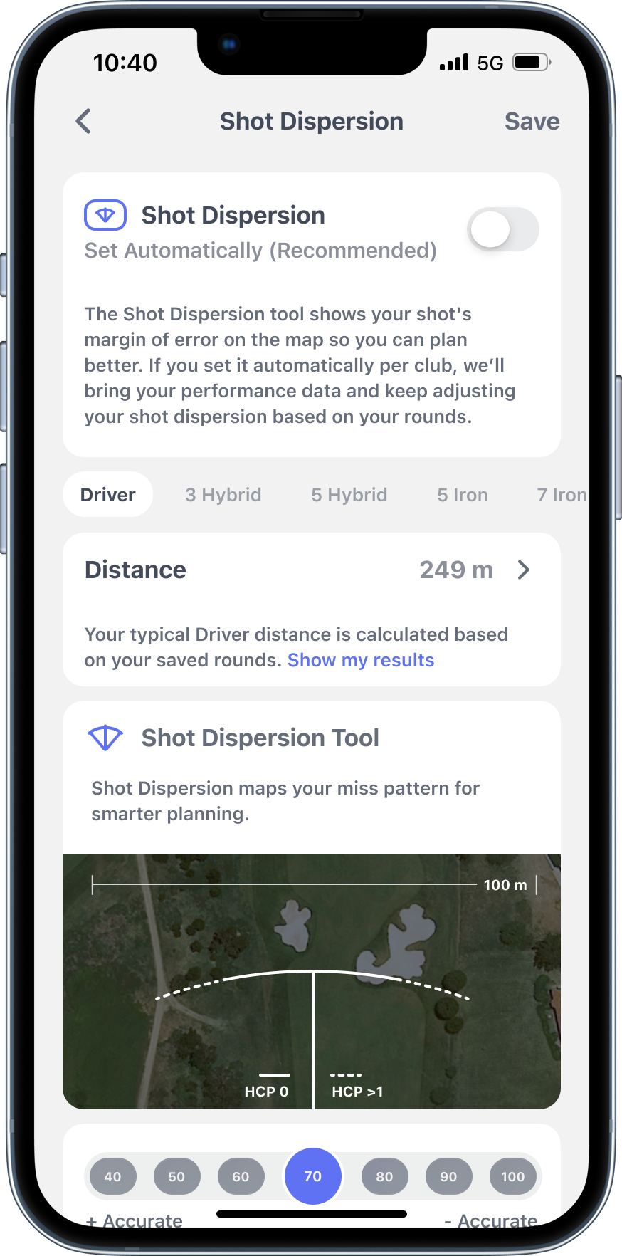 Default settings use handicap-based dispersion patterns, but you can customize them based on your actual performance. As you track more shots, dial in your real patterns for even better decisions.