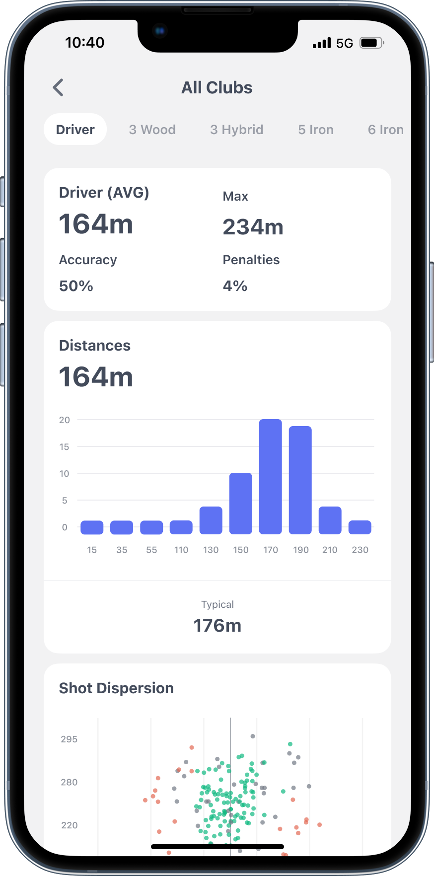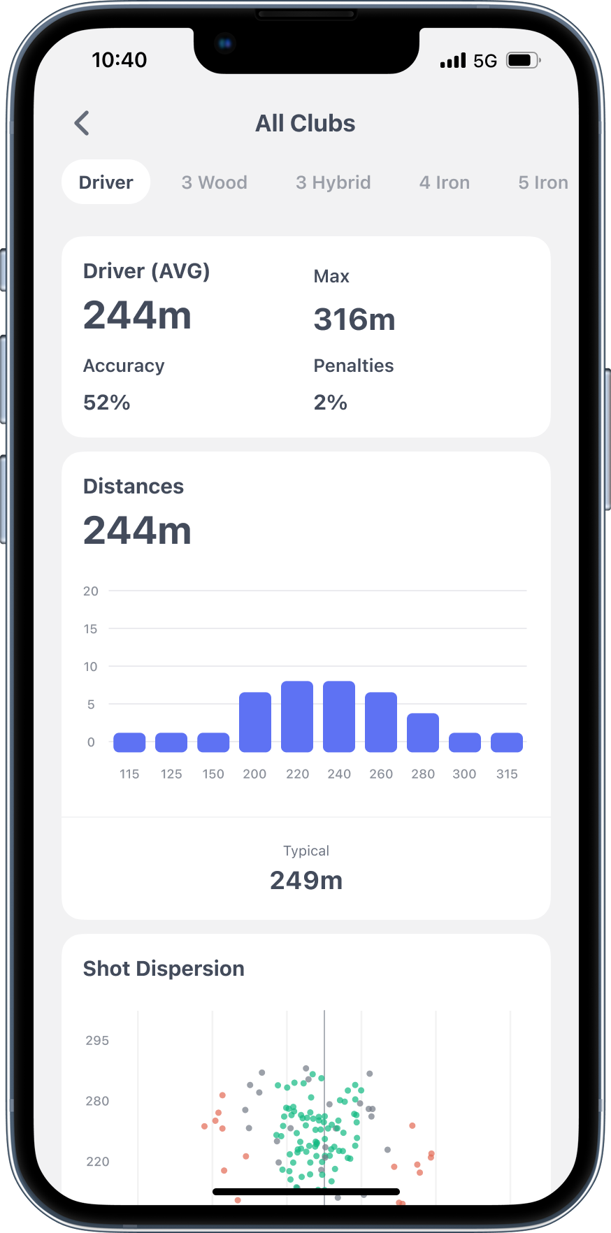 That 250-yard par 4 with trees on both sides? The dispersion arc shows if your driver fits - or if your 4-iron is the smarter play.
