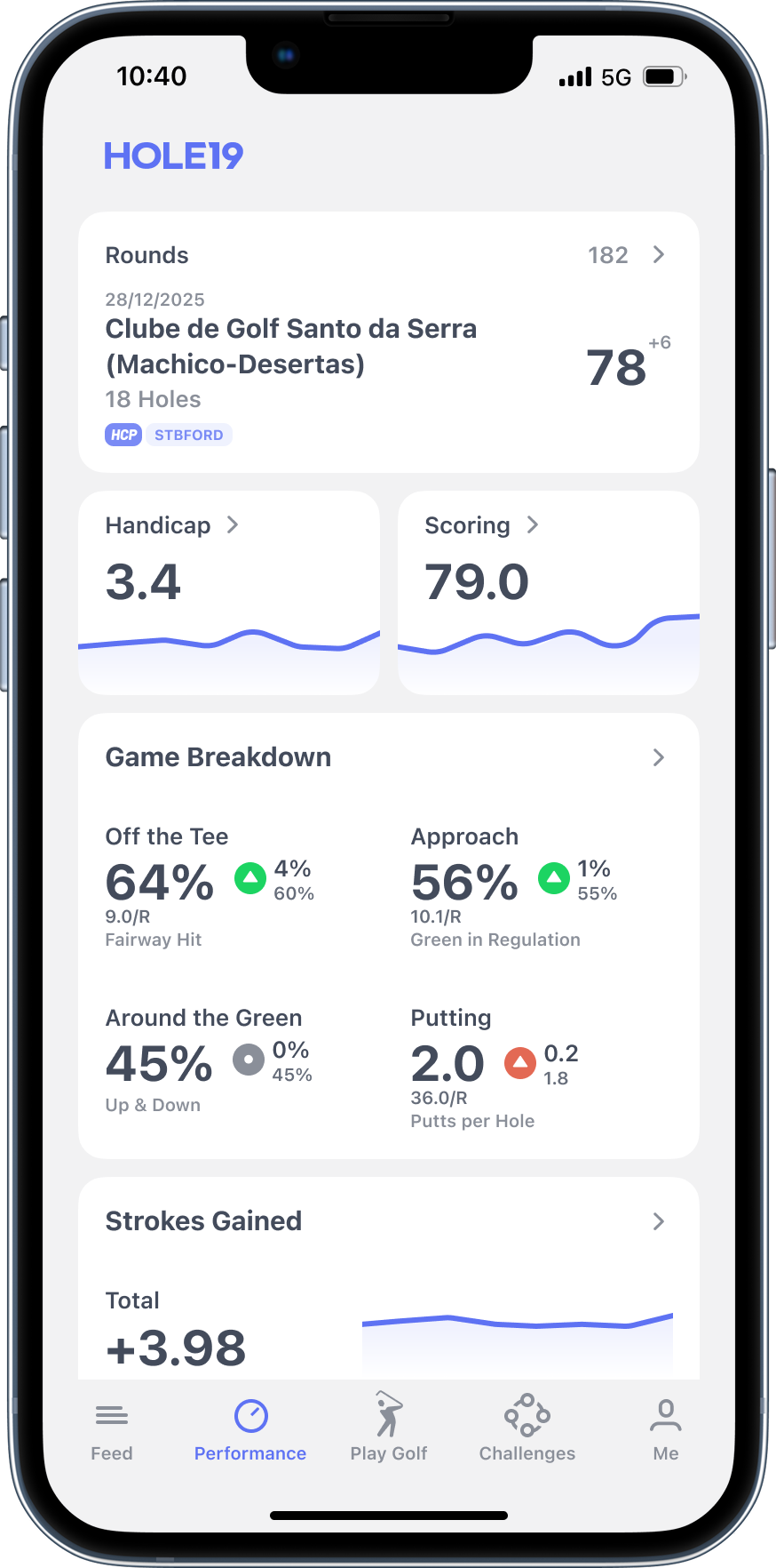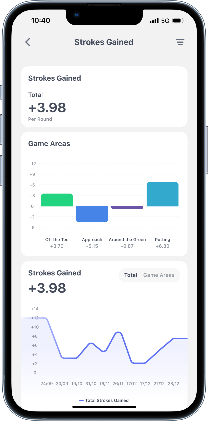 Strokes Gained analytics break down your performance across tee shots, approach, around the green and putting. Finally understand if it's your driver off the tee or that three-putt habit that's killing your scores.