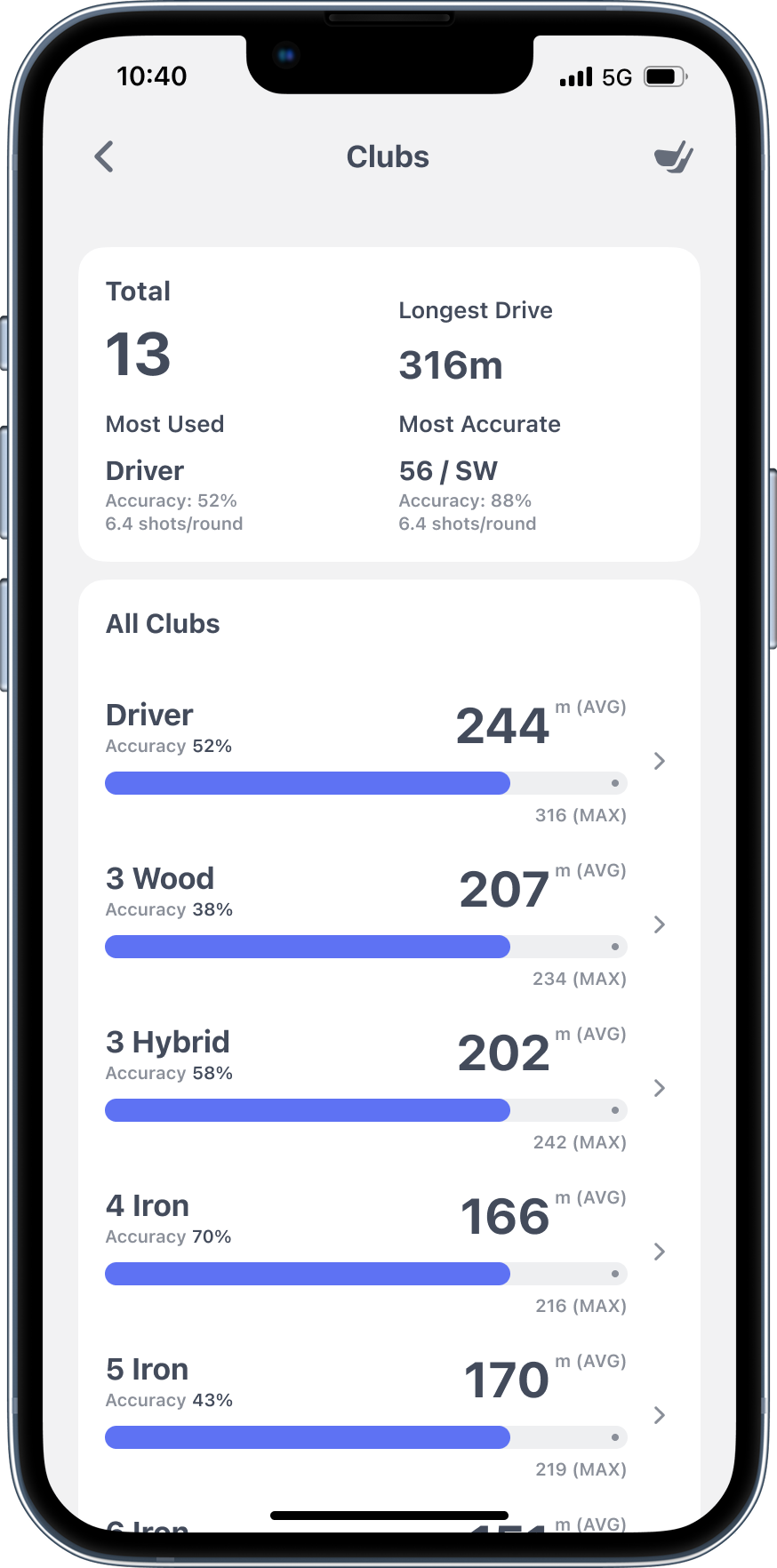 Know your real total distances for every club. No more "I hit my 7-iron 170" when the data says 155.